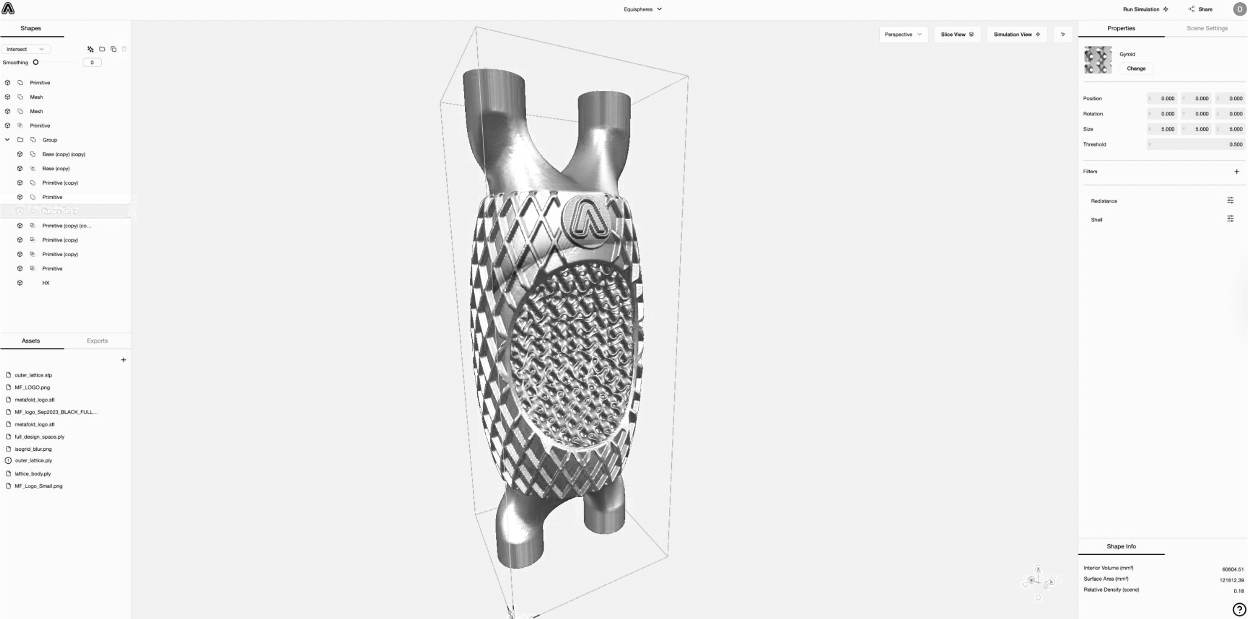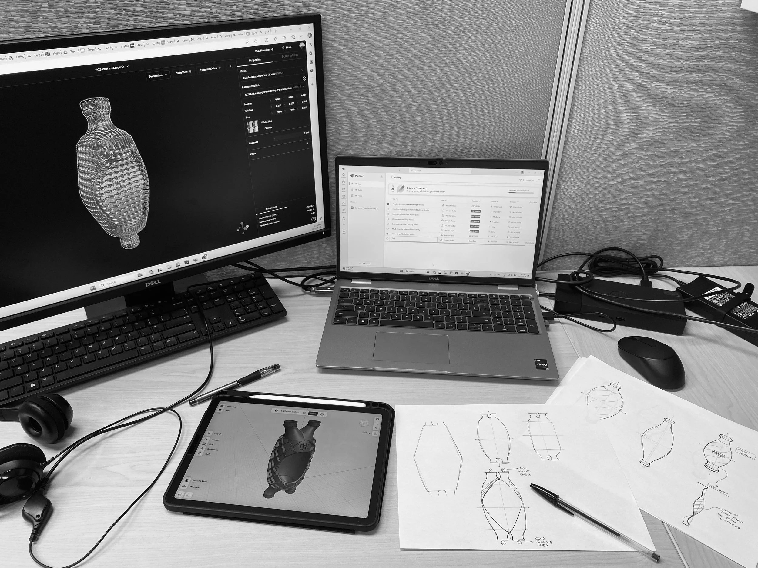 With a clear direction established, I moved into concept development and began designing both artifacts in parallel. The satellite bracket was created using generative design in Fusion 360 and printed externally due to in-house size limitations. The heat exchanger followed a multi-software workflow. I collaborated with Metafold 3D to develop the internal gyroid lattice, then refined the model in Netfabb to reduce overhangs and support structures before preparing it for printing.