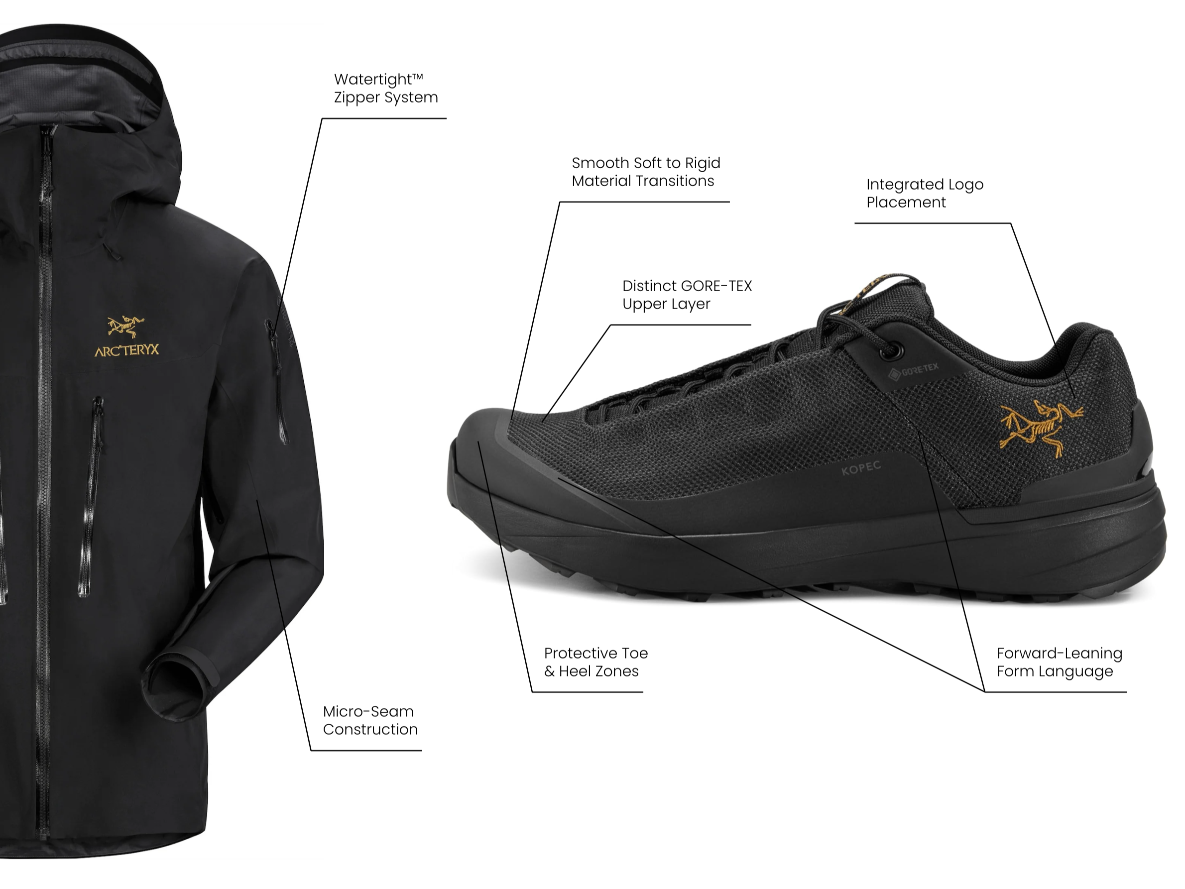 Analysis of the Alpha SV Jacket and Kopec GTX Shoe informed the development of the Peak speaker, highlighting a forward-leaning, sharp form language balanced by smooth transitions between soft and rigid materials. The use of GORE-TEX as an outer layer and subtle, integrated logo placement reflect a function-first approach that was carried through into the speaker design.