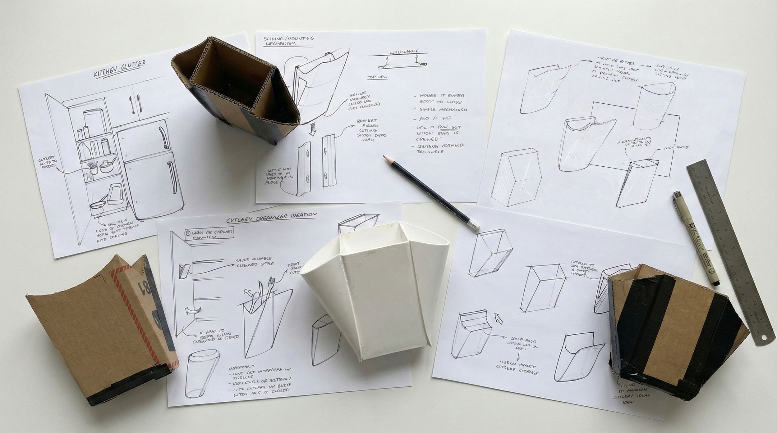 After thoroughly analyzing the problem, I explored a wide range of forms and systems to organize cutlery, keeping key parameters in mind: ease of access, space efficiency, and separate compartments for organization. Feedback guided me toward the wall-mounted concept, which best addressed these needs. Using cardboard prototypes, I tested different forms, with each iteration providing valuable insights that ultimately led to the final design.